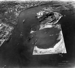 The second alteration to Los Angeles’ geographic features to support the Anglo vision included in my research, is that of Deadman’s Island (Pictured above). Named by the Spaniards La Isla de los Muertos and later Americanized to Deadman’s Island according to the Los Angeles Corral’s Westerners Brand Book supplied by the California State University Dominguez Hills Archives, was an approximately eight hundred feet long, two hundred and fifty feet wide and over sixty feet high island stationed in the inner harbor of San Pedro Bay. The island would disappear not long after Anglo immigration into the region. The prominent natural landscape feature holding rich history for generations of Tongva, Spanish and Mexican residents was destroyed to achieve the Anglo vision of Los Angeles.